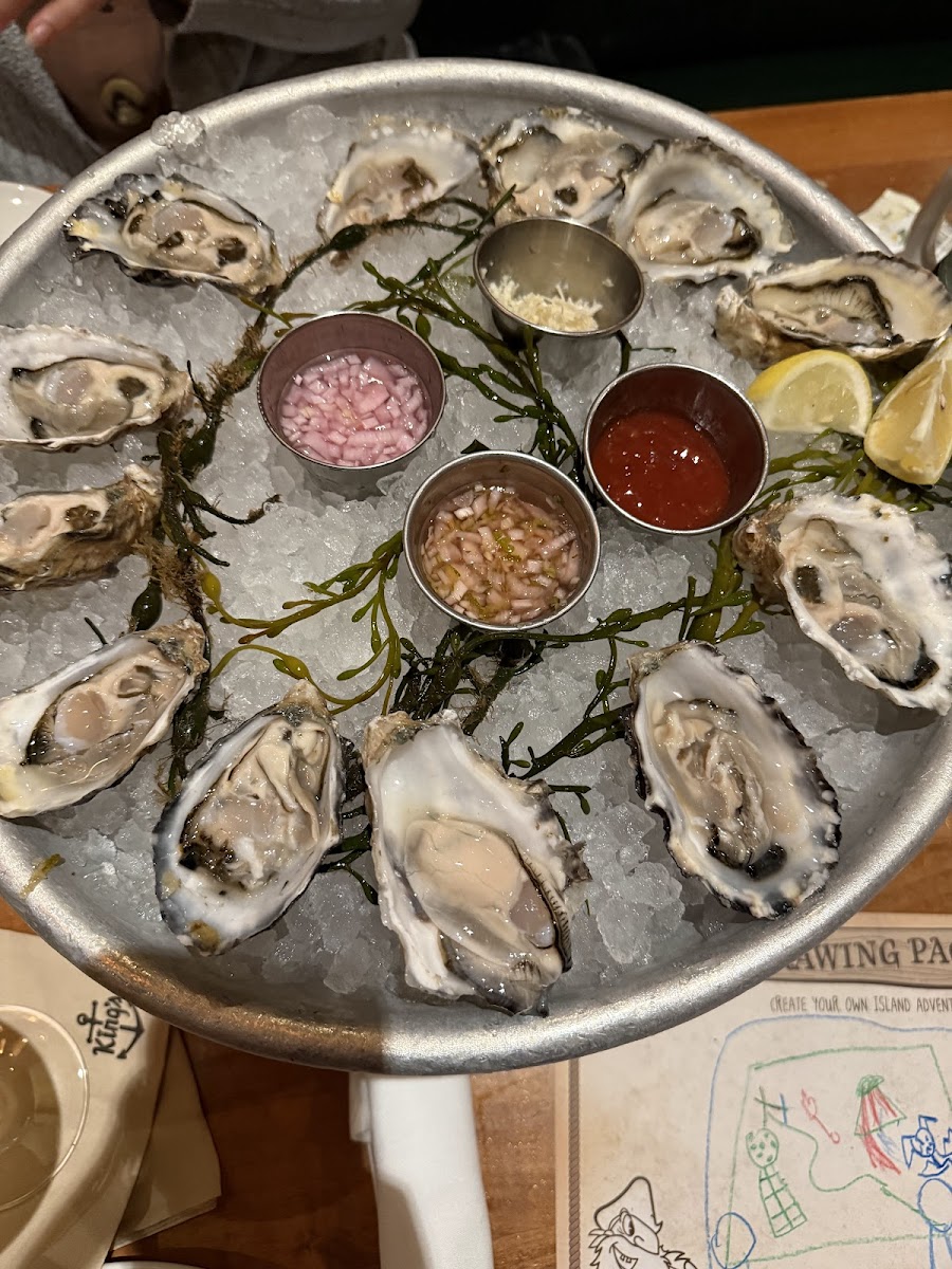 King's Fish will always be a great go-to for seafood as their locations are always very convenient and strategic. It's our first time in this location, and the ambiance once again didn't disappoint - the décor, lighting, colors and seating all blend elegantly. The oysters we had were the best I had in a while! We got the Henderson Bay oysters and we topped each oyster with all the 4 condiments served there (I think it's cocktail sauce, vinegar, onions and radish) and the combination of flavors was a bomb. I was a bit disappointed with my Wild Mexican White Sea Bass, it is not as flavorful as I hoped it would be, and didn't care much for the zucchini sides, but I did enjoy my meal. The Roasted Brussel Sprouts was great. My friend had a Wild Rose Chilean Sea Bass and omg, the fish melts in your mouth. I'll remember this when I come back.